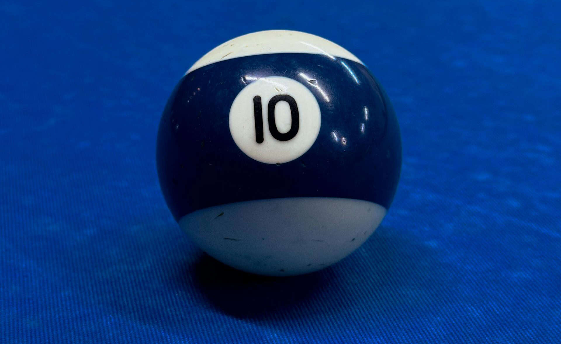 A striped #10 billiard ball against blue felt.